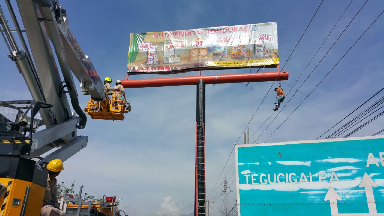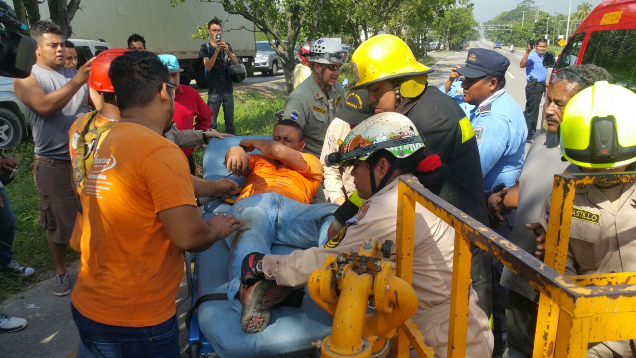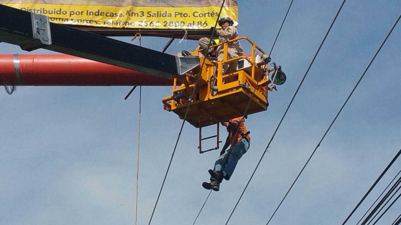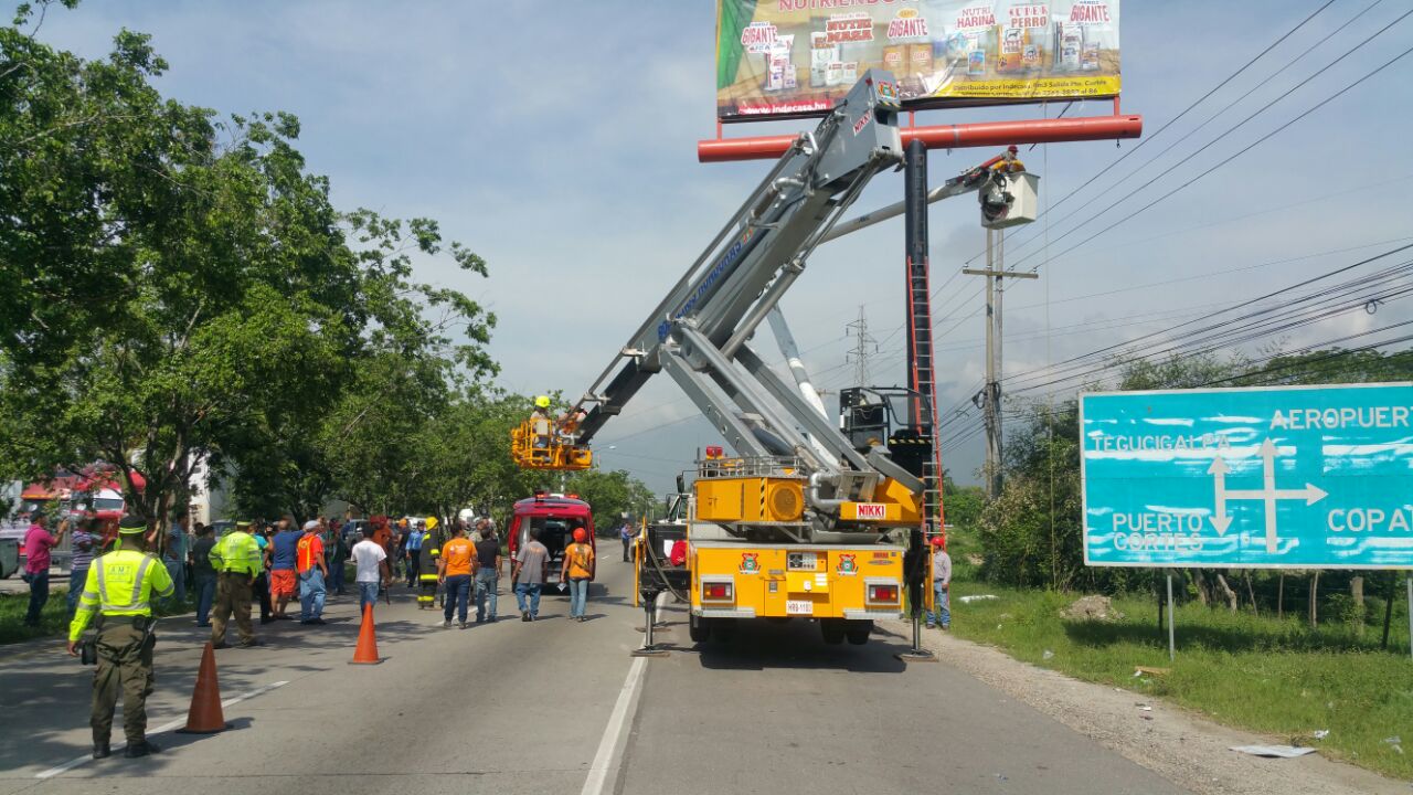 SAN PEDRO SULA.- Un hombre que se encontraba trabajando en un rótulo cerca de la colonia Fesitranh, en la salida a Cortés de la capital industrial, perdió el equilibrio y cayó peligrosamente justo encima del tendido eléctrico.
