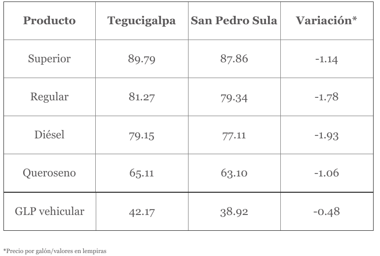 Tras diez semanas de rebajas consecutivas estas representan un acumulado de L13.71 en la gasolina superior, L13.50 en la regular, L11.00 en el diésel L9.26 en el gas licuado del petróleo (GLP) de uso vehicular.