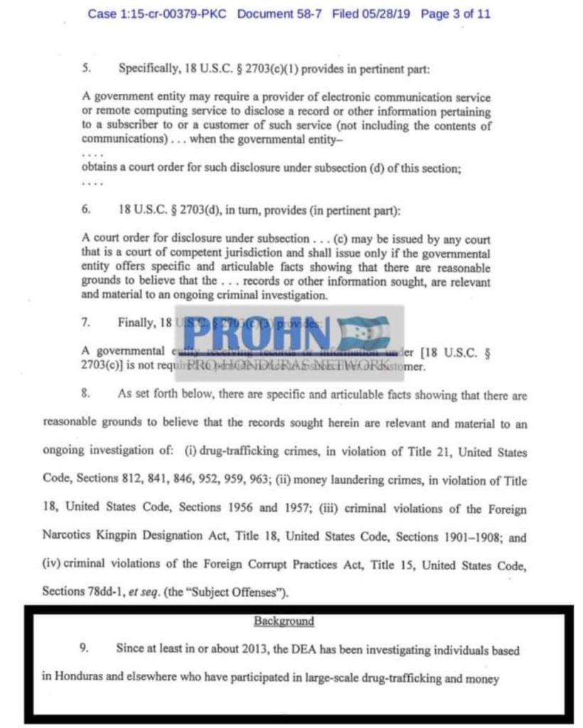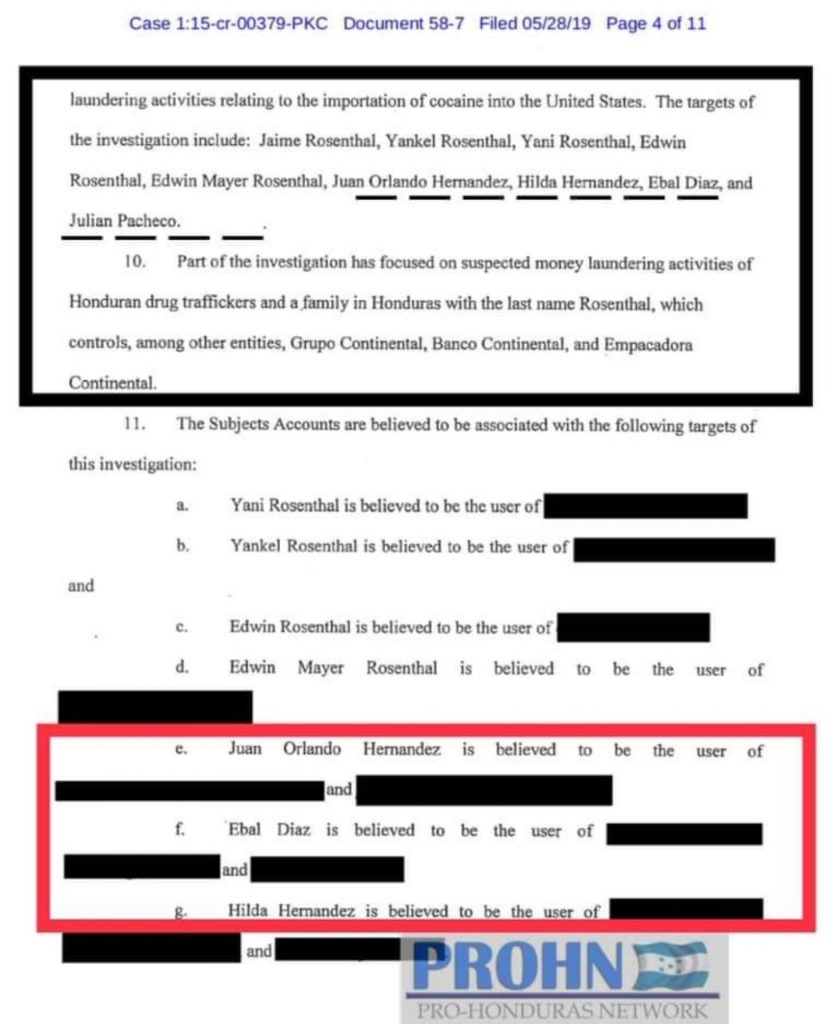 TEGUCIGALPA.- Un documento clasificado como del año 2015 fue lanzado al público por el Departamento de Justicia de los Estados Unidos en el que se revela que el actual presidente del país, Juan Orlando Hernández, su hermana, Hilda Hernández, su ministro Ebal Díaz y el Ministro de Seguridad, Julián Pacheco, han estado bajo investigación por relación al narcotráfico.