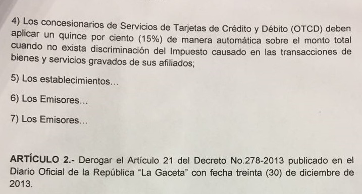 «El espíritu de la Reforma hecha en el artículo 211 numeral 2 del Código Tributario fue que los Emisores, Operadores y Concesionarios de Tarjetas de Crédito y Débito únicamente retuvieran el impuesto sobre ventas cuando NO exista discriminación del impuesto causado en las transacciones de bienes y servicios gravados de sus afiliados. Caso contrario no debía haber retención y entregarse a los comercios afiliados.