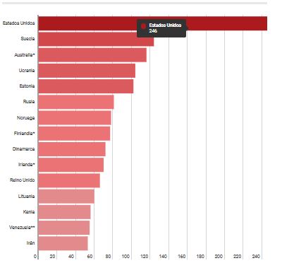 Si los datos se desglosan por país, Estados Unidos es, con mucha ventaja, el que tiene el mayor número de fallecimientos por consumo de drogas en términos absolutos: 52.404 anuales para la UNODC. Pero es también el que lidera el ranking de mortalidad cada millón de habitantes, con 245,8. Considerando sólo a las naciones con estadísticas más o menos actualizadas —Islandia, Canadá y El Salvador están también entre los primeros, pero según datos de hace más de una década—, en segundo lugar está Suecia, con una tasa de 124,5. La lista de los primeros 15 se completa con Australia (116,2), Ucrania (104,9), Estonia (102,9), Rusia (81,1), Noruega (78,4), Finlandia (77,8), Dinamarca (72,3), Irlanda (70,8), Reino Unido (66,7), Lituania (60), Kenia (56,1), Venezuela (55,3) e Irán (53,2).