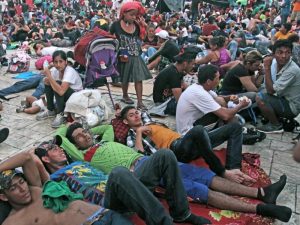 Dejando atrás a esta familia para que reponga fuerzas, y evitando pisar las mantas de las miles de personas que inundan la plaza, nos aborda Miguel, un migrante guatemalteco desesperado por encontrar a sus sobrinos: «Por favor denúncielo, agentes de migración mexicanos me quitaron a mis dos sobrinos menores de edad en el retén de Viva México. No he vuelto a saber de ellos y nadie me da respuestas«.