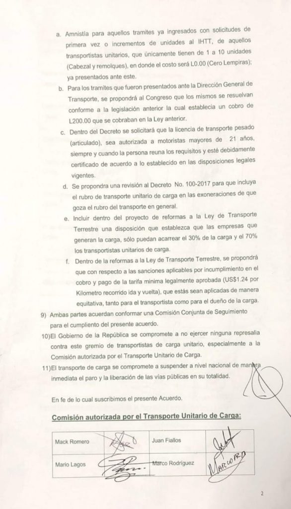 TEGUCIGALPA./ El gobierno y representantes del transporte de carga llegaron a un acuerdo la madrugada de este jueves, por lo que se disuelven los paros del rubro que fueron marcados la presente semana.