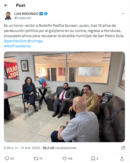 El presidente del Congreso Nacional, Luis Redondo, recibió este martes al exalcalde de San Pedro Sula, Rodolfo Padilla Sunseri, beneficiado con amnistía política, quien aspirará a ser precandidato a alcalde por la comuna de la ciudad industrial del país.